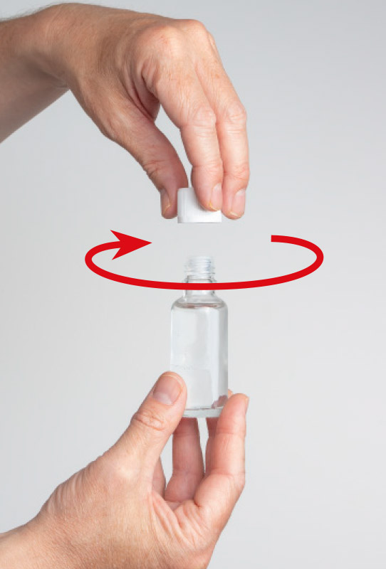 Otevřete lahvičku RAVICTI lehkým stlačením víčka a otáčením směrem doleva.