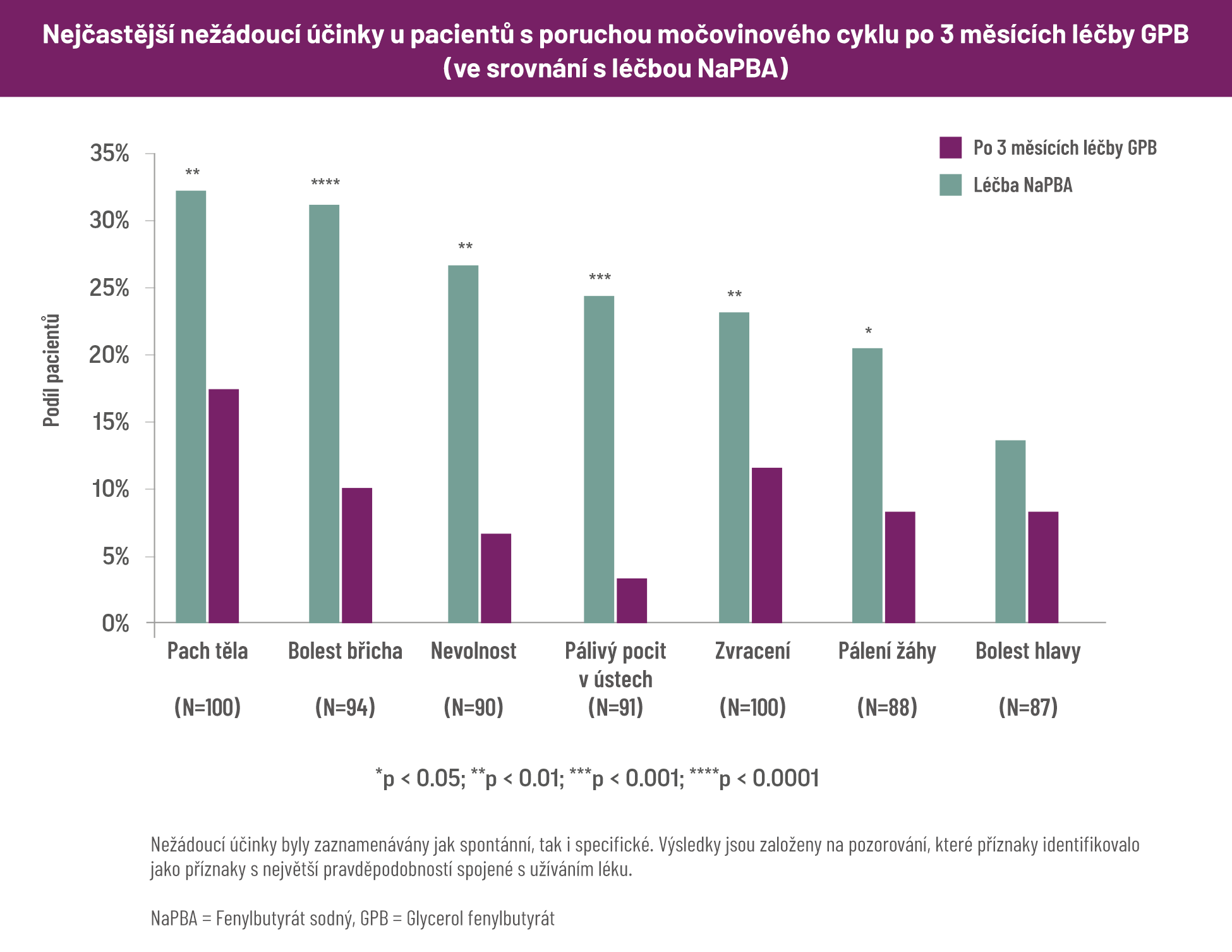 Sto pacientů nebo jejich pečovatelů odpovědělo na nevalidovaný dotazník specifický pro UCD včetně předem definovaného seznamu běžných příznaků spojených se zachytávačmi dusíku. Výchozí hodnoty (když pacienti užívali fenylbutyrát [NaPBA]) byly porovnány s hodnotami po tříměsíční léčbě glycerolfenylbutyrátem (GPB).3